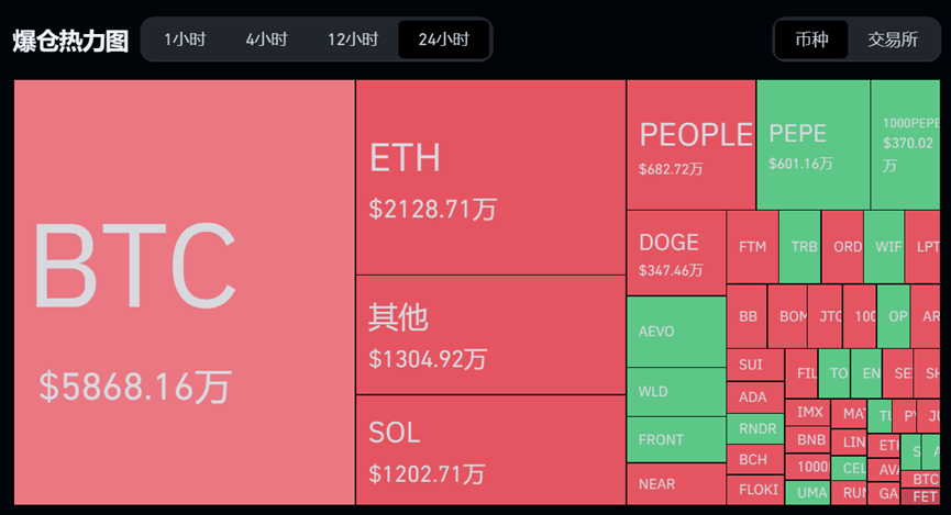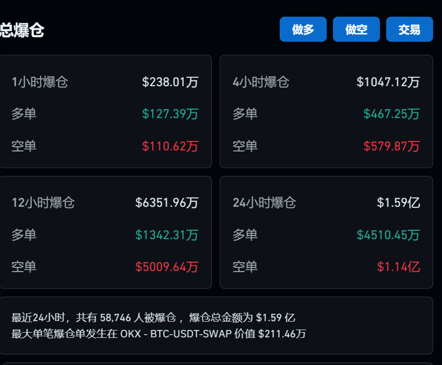 根据加密货币检测网站coinglass数据,最近24小时,共有58751人被爆仓 ,爆仓总金额为1.59亿美元。最大单笔爆仓单发生在OKX - BTC-USDT-SWAP中,价值211.46万美元,相当于约1526万元。
