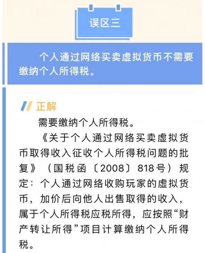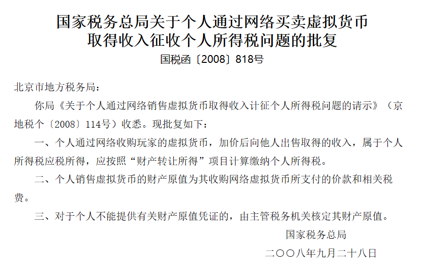 1月5日,国家税务总局上海市税务局在官方公众号发布《个人所得税经营所得和分类所得常见误区》的文章(现已删除),其中第三条指出:个人通过网络买卖虚拟货币需要缴纳个人所得税,并引用《关于个人通过网络买卖虚拟货币取得收入征收个人所得税问题的批复》(国税函〔2008〕818号)规定:个人通过网络收购玩家的虚拟货币,加价后向他人出售取得的收入,属于个人所得税应税所得,应按照“财产转让所得”项目计算缴纳个人所得税。