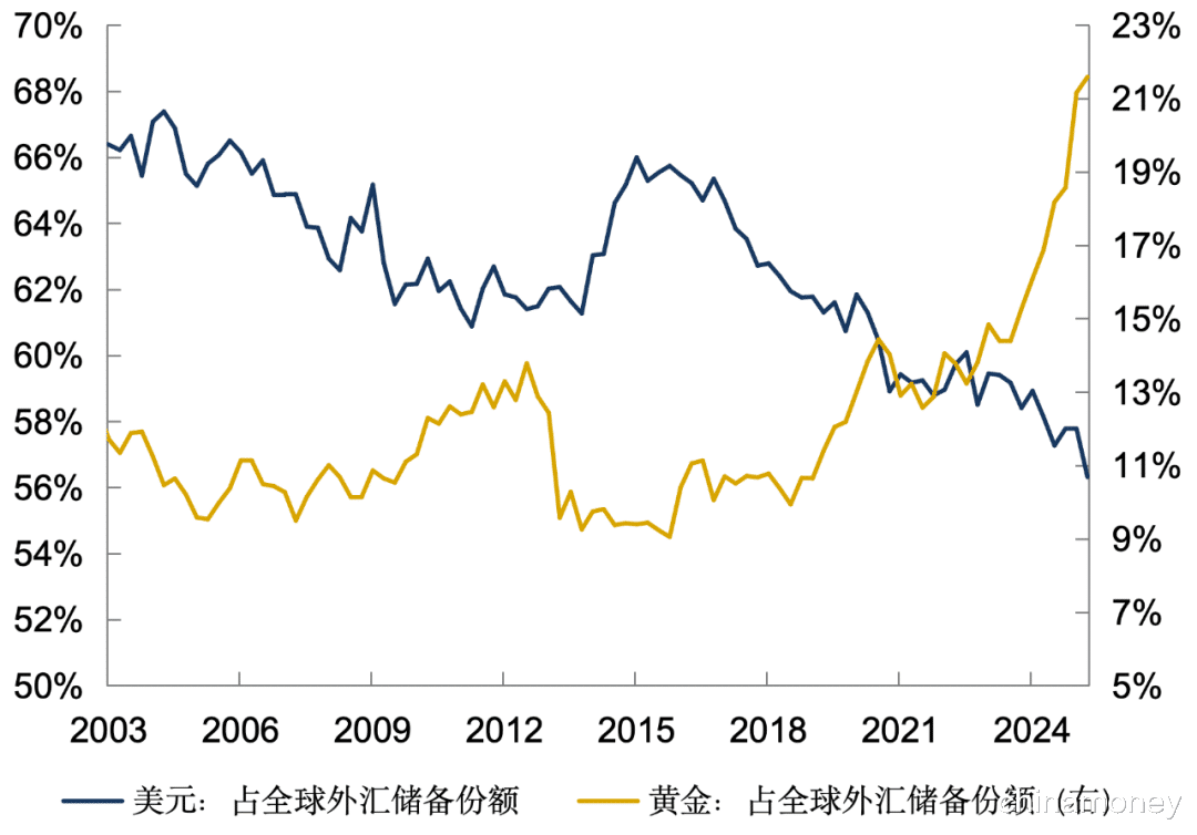 根据世界黄金协会与IMF数据,截至2025年中,黄金在全球央行外汇储备中的比重升至23%,而美元降至56%。如果该趋势延续,那么到2040年左右,黄金将取代美元,重新成为全球第一大储备资产。