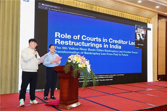 发言人分别为浙江大学光华法学院副教授、浙江大学光华法学院破产法研究中心执行主任、研究员石一峰,英国贝尔法斯特女王大学讲师杨梓,英国利兹大学法学博士、山西财经大学讲师米帅豪,印度 Ish ana Tri pathi(其发言由英国利兹大学法学博士、山西财经大学讲师米帅豪,英国谢菲尔德大学法学学士、英国法律大学法学硕士王懿萱合作翻译),四位发言人的发言题分别为:上市公司庭外重组的制度构建、英国法框架下虚拟货币投资平台破产风险研究、英国的庭外重组制度、Role of Courts in Creditor Led Restructurings in India(法院在印度的债权人主导重组制度中的作用)。