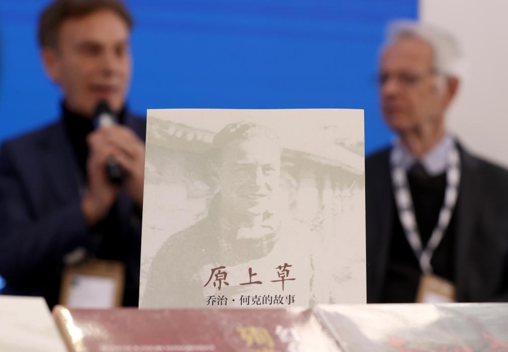 这是3月12日在英国伦敦书展上展示的《原上草:乔治·何克的故事》中文版新书。新华社记者 李颖 摄